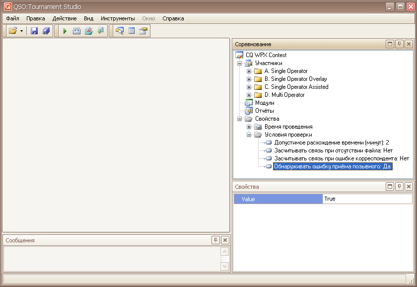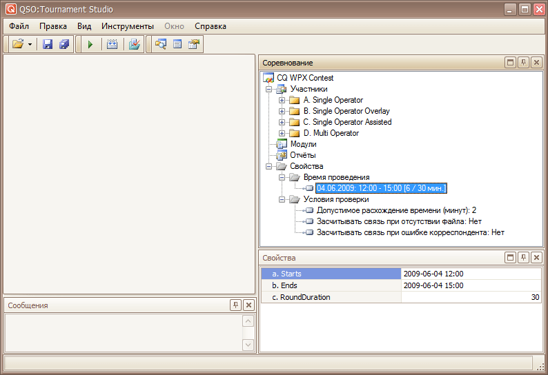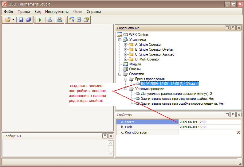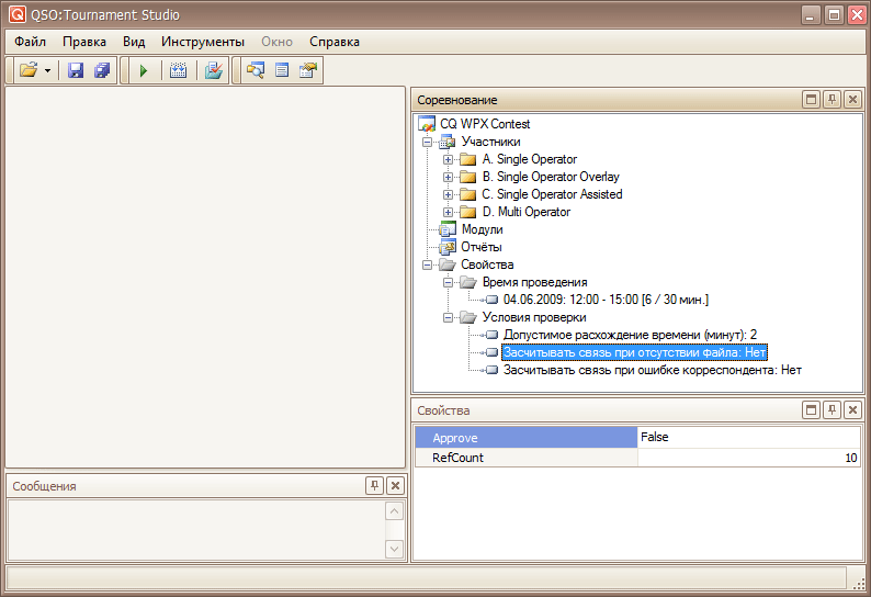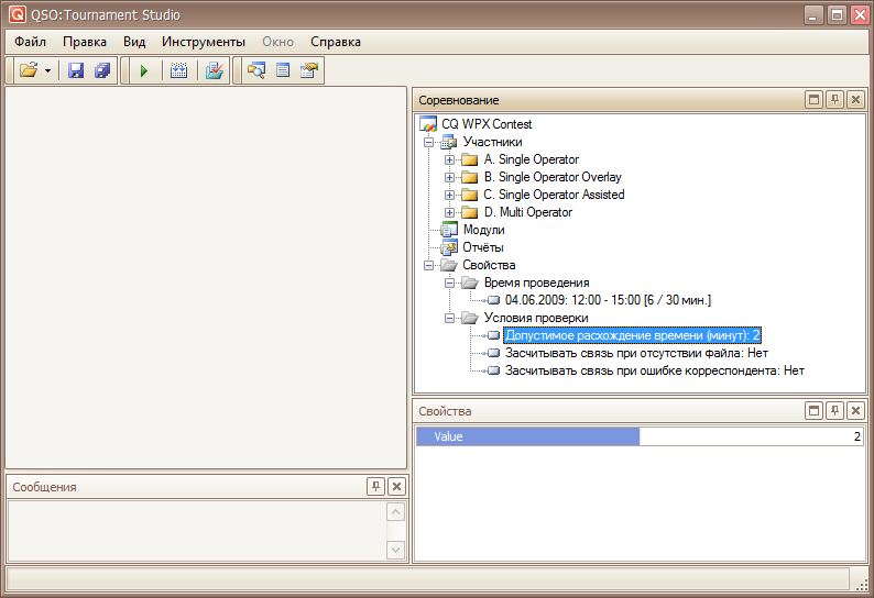 Настройки алгоритма доступны в элементах узла "Свойства" дерева соревнования.